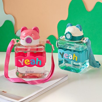 2024 nuovo 600ml orso quadrato bottiglia di acqua di plastica per bambini estate all'aperto cartone animato tazza per bere con paglia